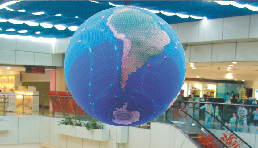 LED球形顯示屏能夠實現360度的可視角度,全方位的播放視頻,各個角度都能感受到良好的視覺效果,沒有平面視角的問題,并且能夠根據具體需求將球形素材直接映射到顯示屏上面,比較常見的有地球、足球等,讓人感覺惟妙惟肖。根據客戶需求和安裝環境定制尺寸大小。