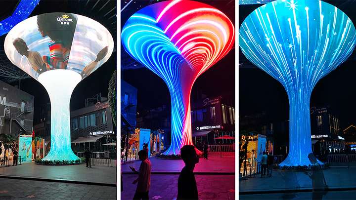 這塊異形LED顯示屏由上海智彩專案定制,高達12米,面積達113.4平方米。獨特的造型,絢麗的顯示效果,光與影交匯,聲與色齊聚,給人以非常震撼的感官體驗。